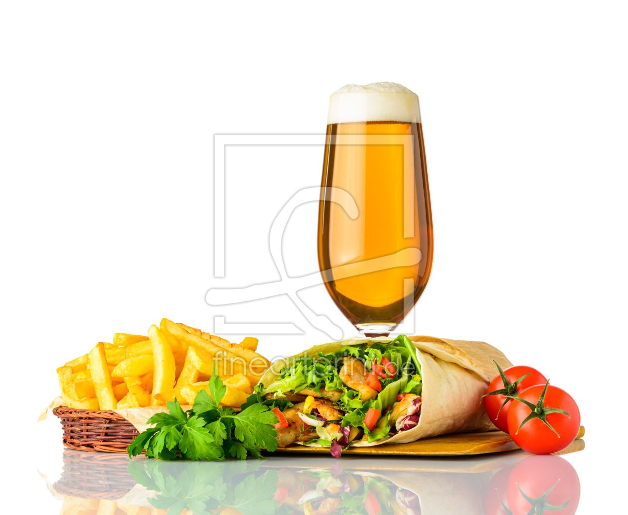 Shawarma mit Pommes und Bier auf Weiß