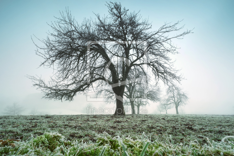 Kahler Baum auf einer gefrorenen nebligen Wiese