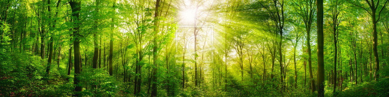 Wald Panorama mit grünen Buchen und Sonnenstrahlen