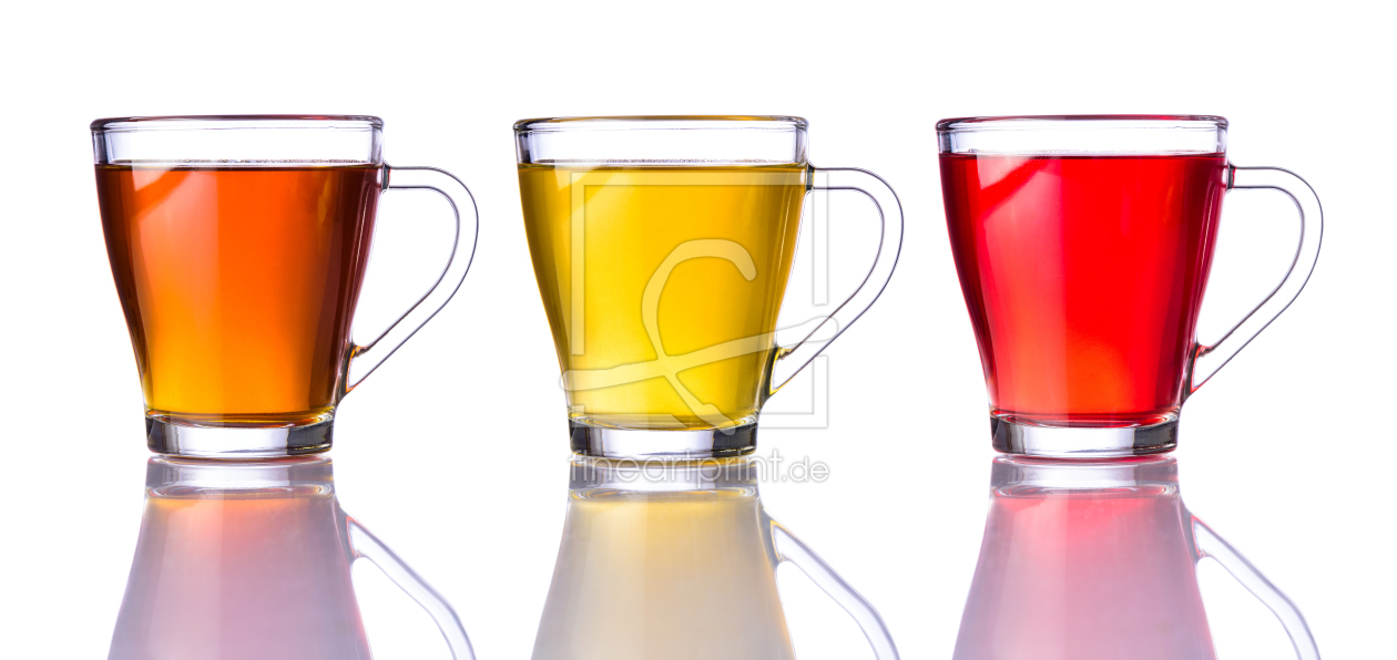 Verschiedene Teetassen mit Tee auf Weiß