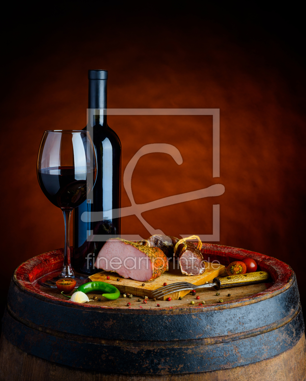 Stillleben mit Rotwein und Geräuchertem Fleisch