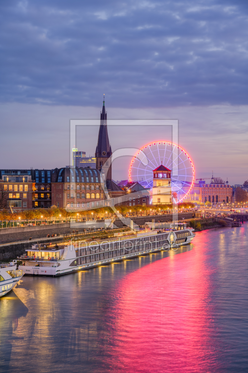 Düsseldorf Skyline mit Schiff bei Sonnenunterg...