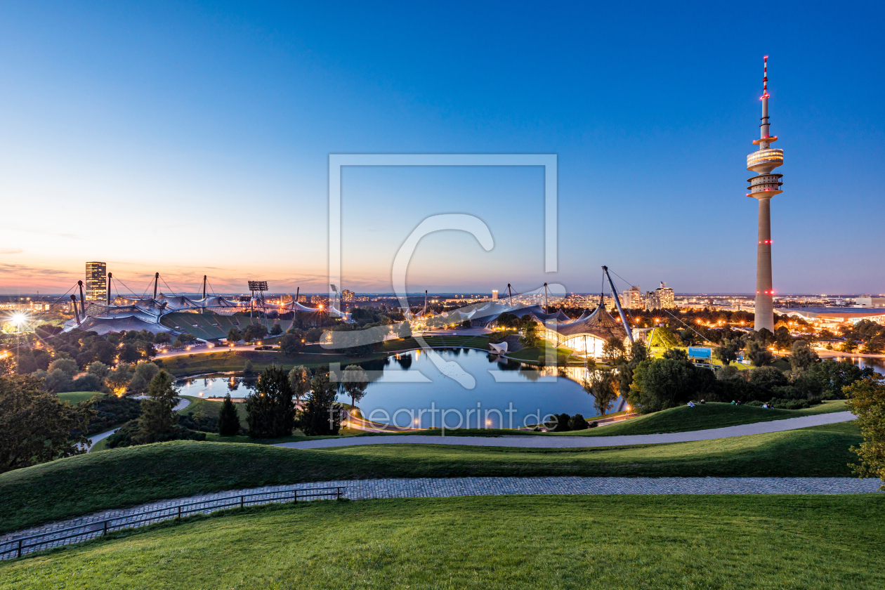 Olympiapark mit Olympiaturm in München am Abend