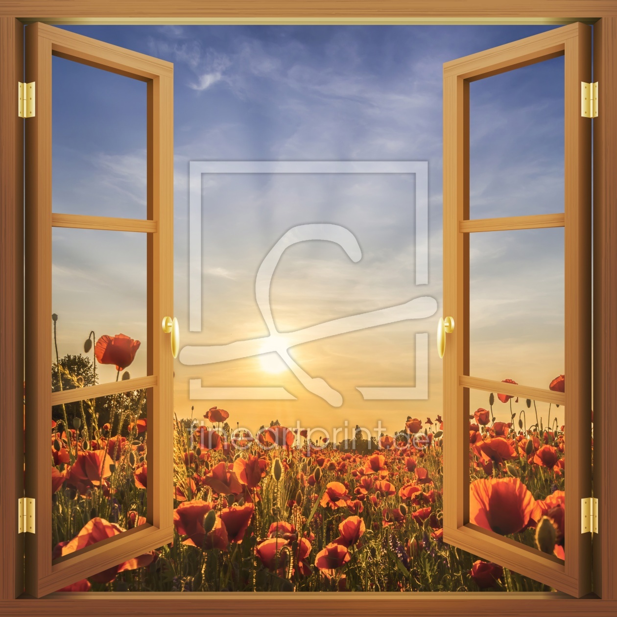 Aussicht auf die untergehende Sonne mi Mohnblumen